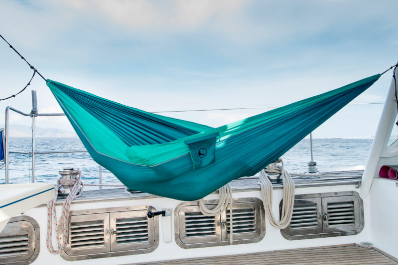 Befestigung: Moonbag und S-Haken sind im Lieferumfang; Aufhängung optional. Empfohlene Aufhängungen: Moonstraps oder Lightest Straps (baumfreundlich). Für feste, häusliche Ankerpunkte eignen sich nautische Seile.